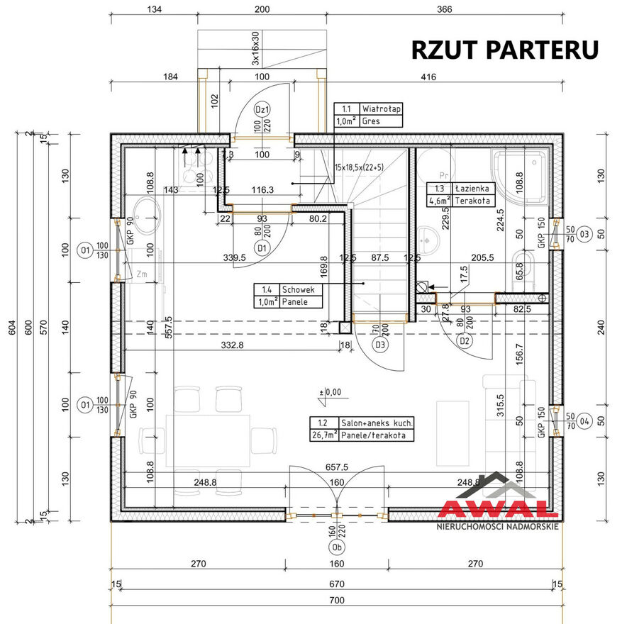 - salonu z aneksem kuchennym o pow. ok. 27 m2 (+ wyjście na zadaszony taras o pow. 21 m2)