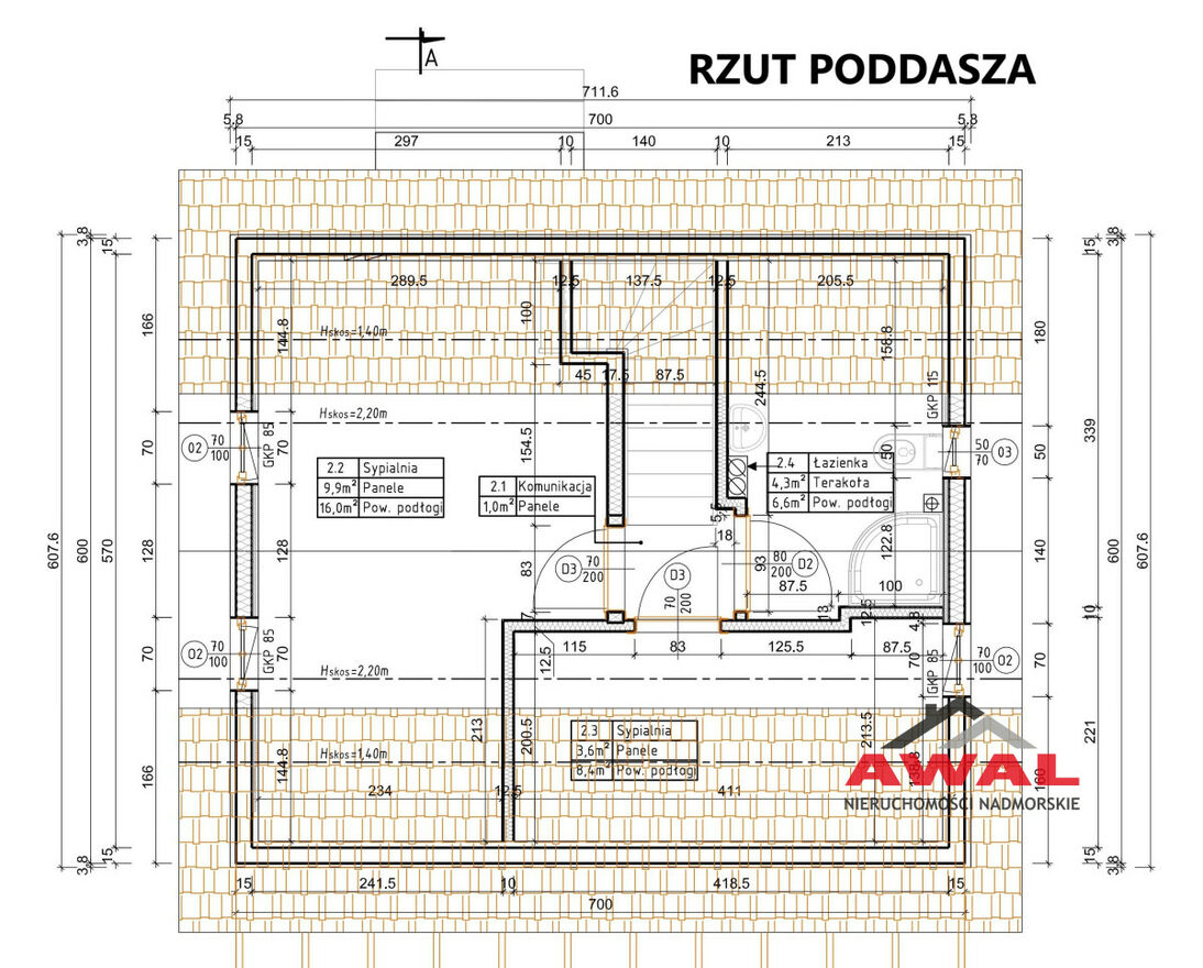 Ściany zewnętrzne parteru szkieletowe z elementów 5/15 cm. Na zewnątrz płyta